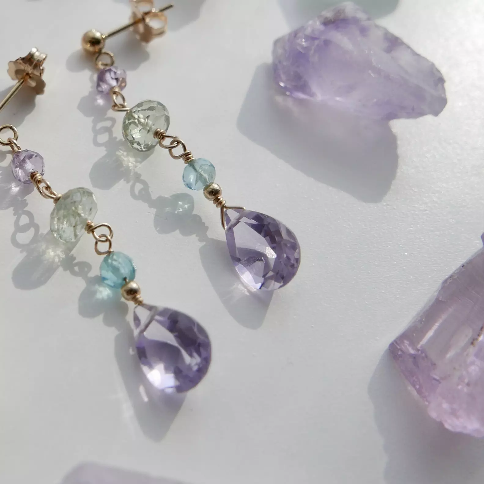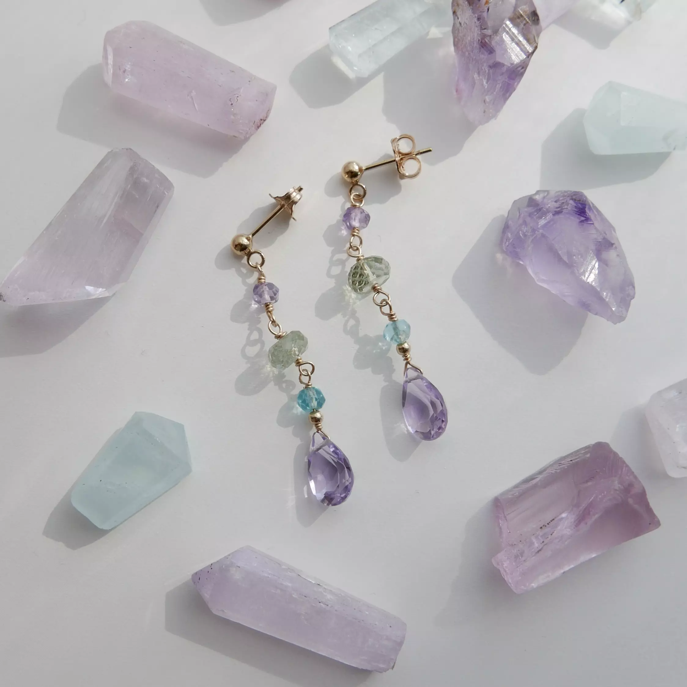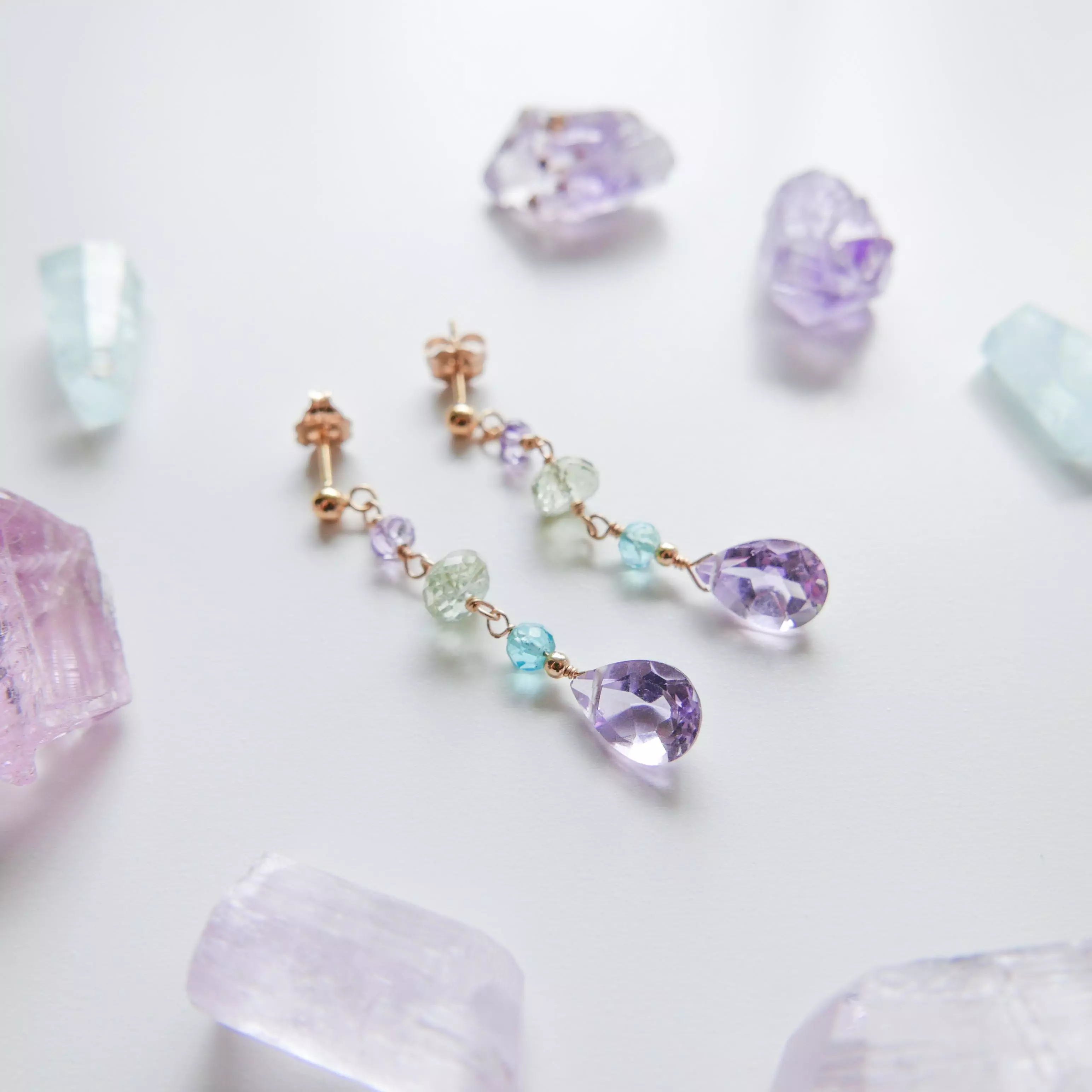 - Kamień: Łezka ametystu klasy AAA szlif gruszkowy, Apatyt fasetowany kulka ok. 3mm, Akwamaryn fasetowany oponka ok. 5x3mm, Ametyst fasetowany kulka ok. 3mm