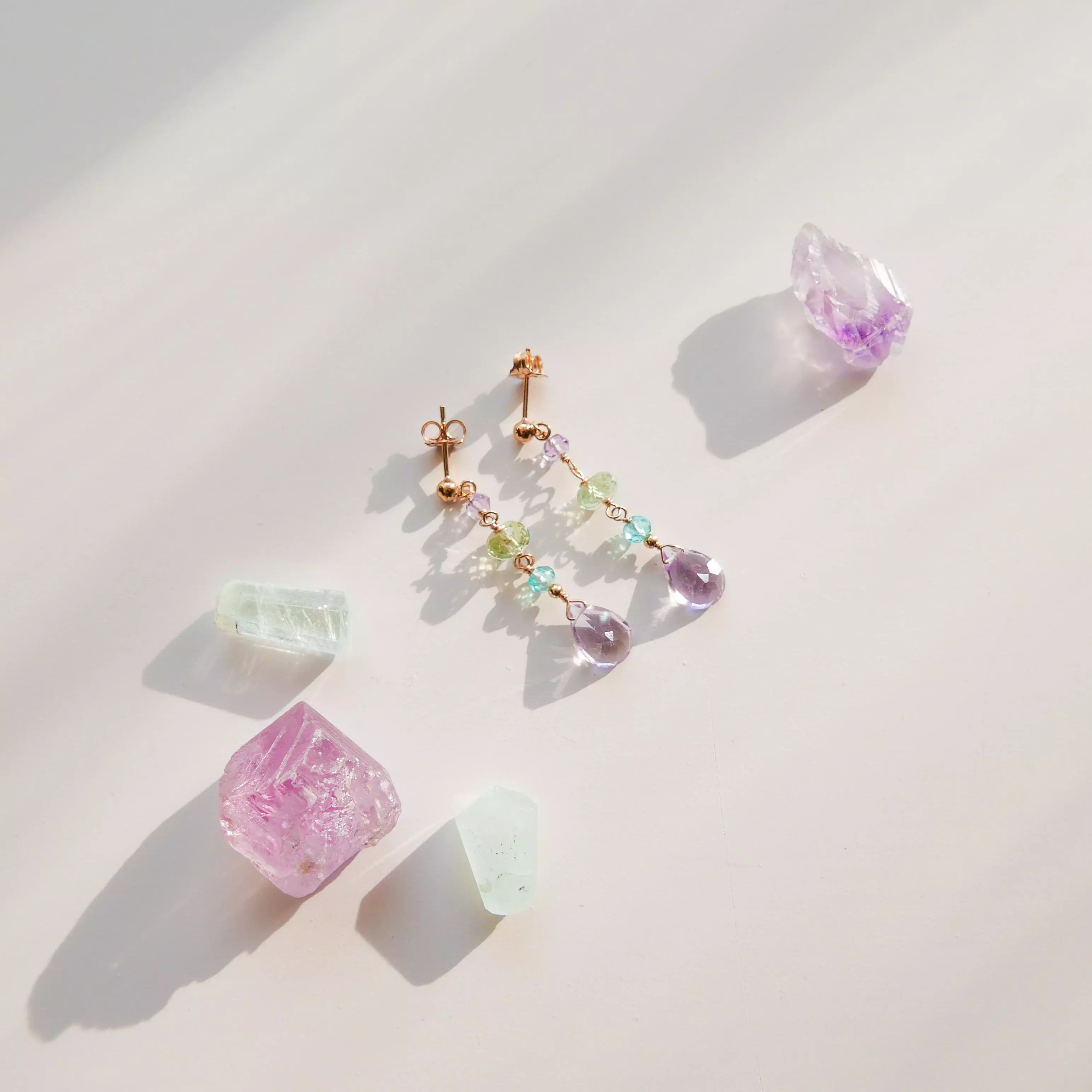 Kolorowe kolczyki damskie z kamieniami naturalnymi łączą w sobie trzy wyjątkowe kamienie naturalne: ametyst, apatyt i akwamaryn, tworząc harmonijną kompozycję kolorów inspirowanych naturą. Subtelne przejścia od fioletu, przez miękką zieleń, aż po chłodny błękit nadają biżuterii świeżości i elegancji. Głównym elementem każdego kolczyka jest fasetowana kropla ametystu, która pięknie odbija światło. Nad nią znajdują się drobne koraliki apatytu i akwamarynu, tworzące lekką, ruchomą formę. Całość zawieszona jest na klasycznych sztyftach wykonanych ze złota plater 585, co podkreśla ich minimalistyczny, a jednocześnie wyrafinowany charakter.
