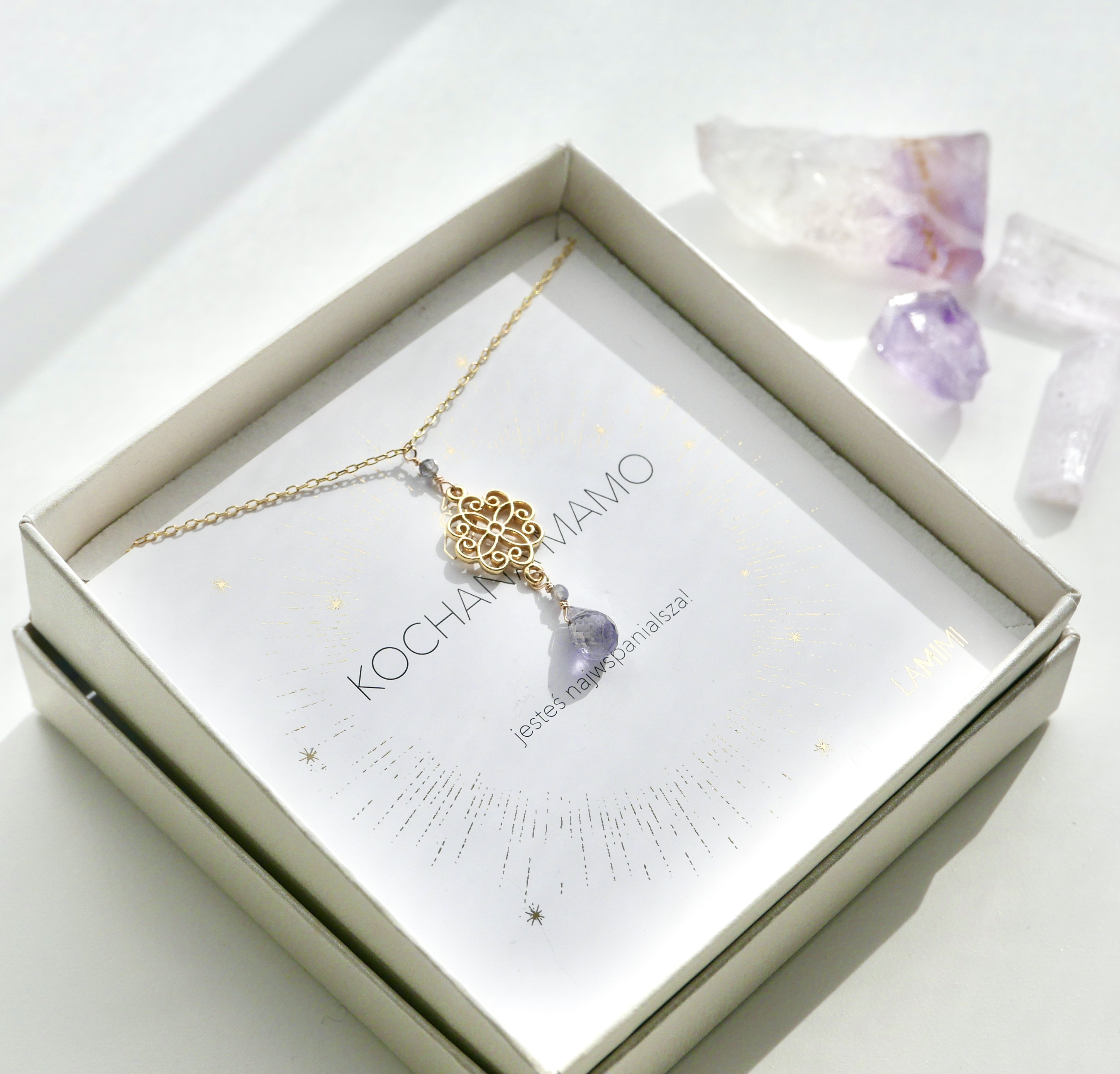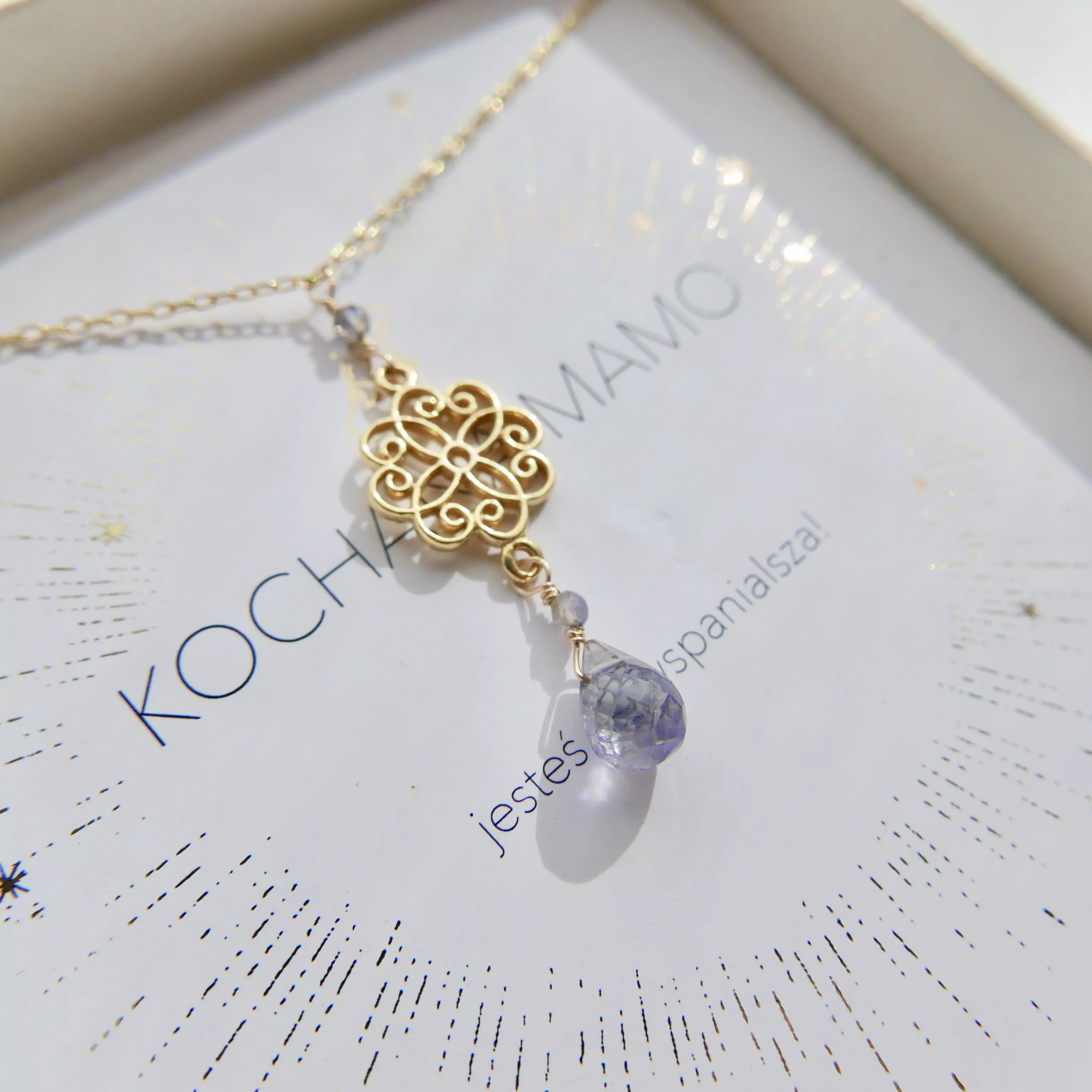 Naszyjnik z zawieszką z kamieniem naturalnym to wyjątkowa biżuteria stworzona z myślą o mamie — symbol intuicji, siły i wewnętrznej równowagi. Srebrny łańcuszek pokryty 24-karatowym złotem zdobi subtelna, ażurowa zawieszka o eleganckim, ornamentalnym wzorze, uzupełniona naturalnym kamieniem iolitu o głębokim, fioletowo-niebieskim odcieniu. Naszyjnik wyróżnia się lekką, elegancką formą, dzięki czemu doskonale sprawdzi się zarówno na co dzień, jak i jako uzupełnienie bardziej eleganckich stylizacji. To biżuteria, która niesie emocje i znaczenie — idealna, jako osobisty talizman.