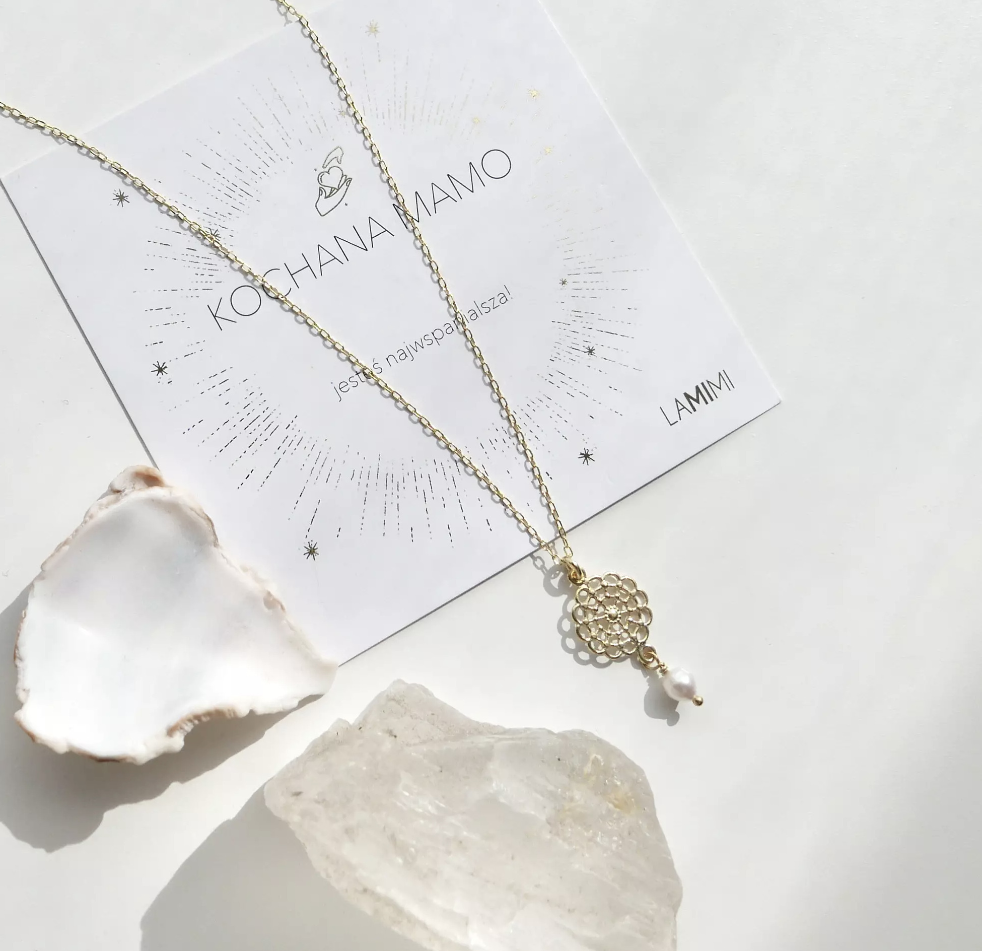 Pozłacany naszyjnik z zawieszką z perłą to wyjątkowa biżuteria stworzona z myślą o mamie — symbol miłości, wdzięczności i bliskości. Delikatny łańcuszek pozłacany 24 karatowym złotem zdobi subtelna, ażurowa zawieszka o harmonijnym wzorze, zakończona naturalną perłą hodowaną. Perła od wieków symbolizuje czystość, mądrość i troskę — wartości, które idealnie odzwierciedlają relację z mamą.
